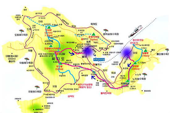 부두 > 야포 > 일출봉 > 망대봉 > 노적 > 혼곡 > 할매바우 > 대기봉 > 태고암 > 시금치재 > 약과봉 > 논골 > 부두(소요시간:4시간30분)